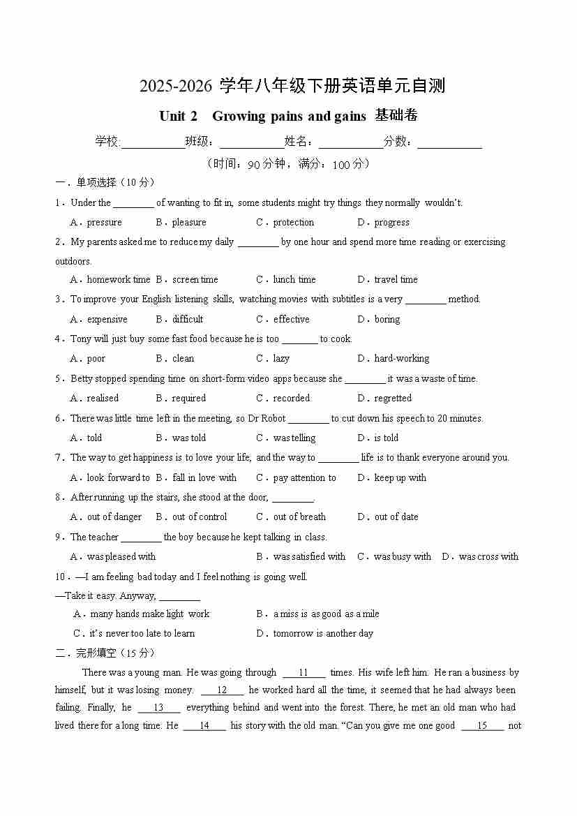 Unit 2 Growing pains and gains (单元自测·基础卷)(试题版A4)