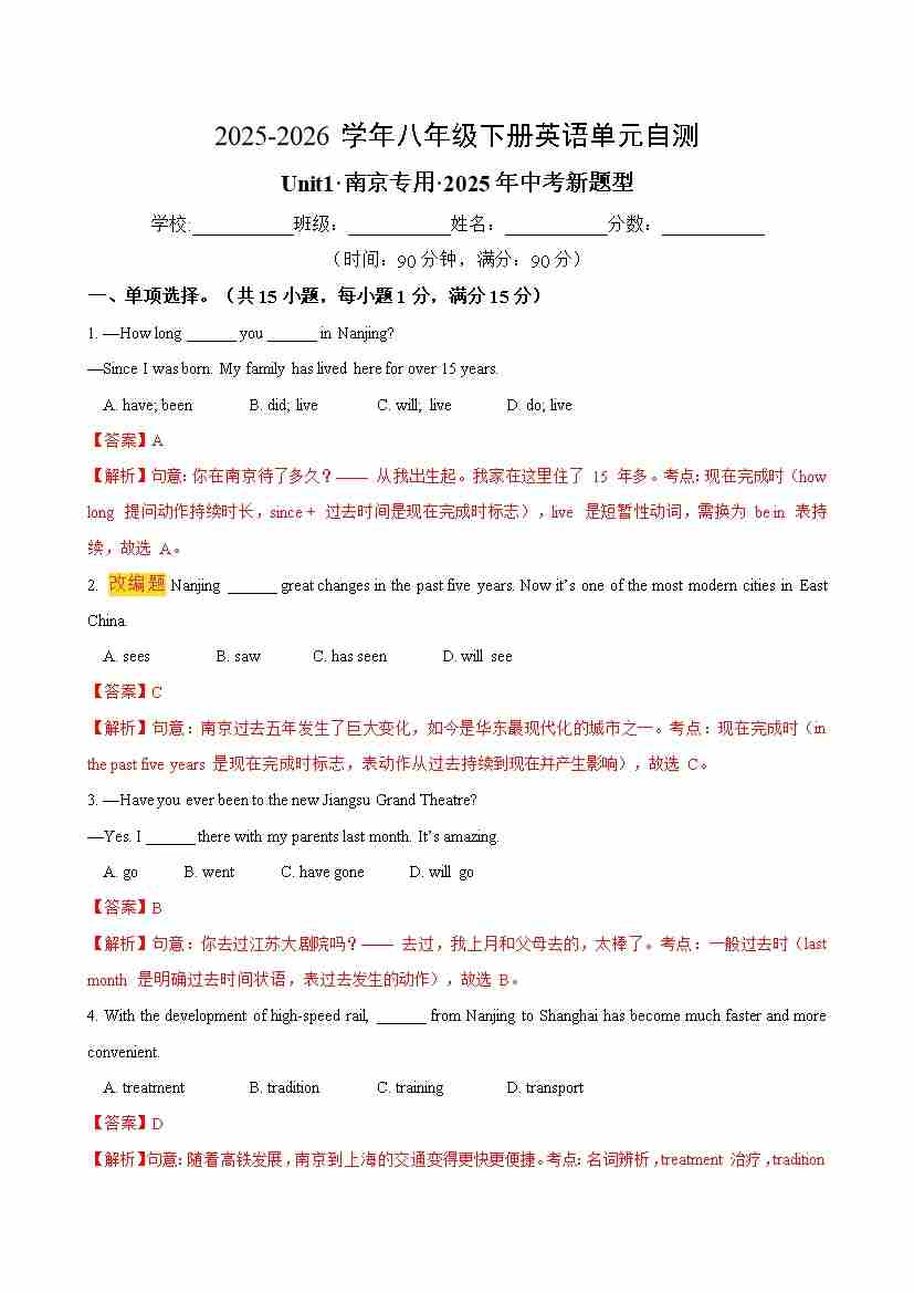 首页 > 全部 > 未知 八年级英语下册Unit1单元自测·南京专用·2025中考新题型(解析版)
