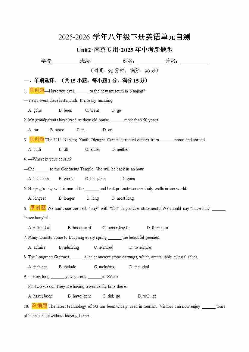八年级英语下册Unit2单元自测·南京专用·2025中考新题型(试题版A4)