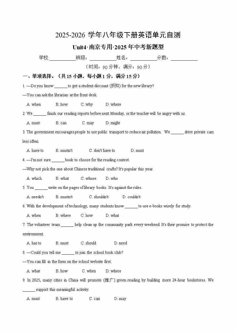 八年级英语下册Unit4单元自测·南京专用·2025中考新题型(试题版A4)