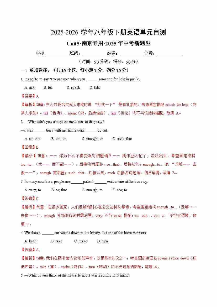 八年级英语下册Unit5单元自测·南京专用·2025中考新题型(解析版)