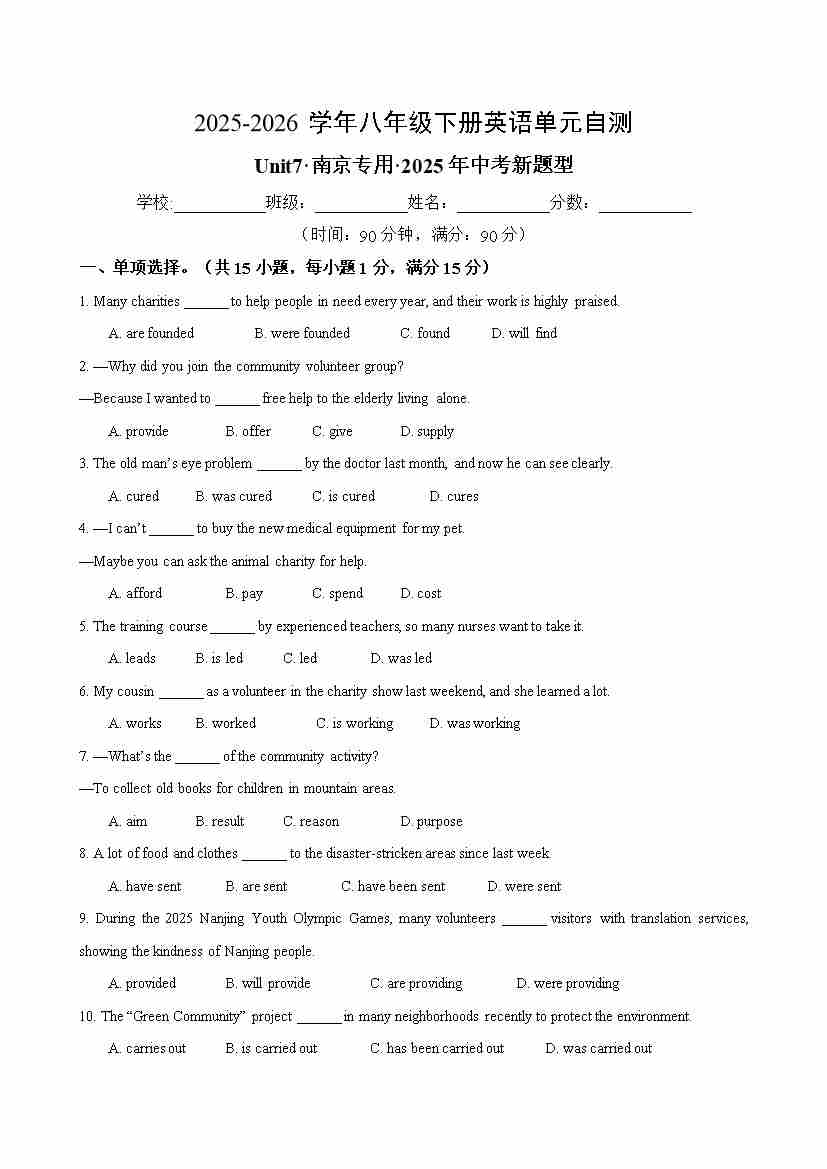 八年级英语下册Unit 7 单元自测·南京专用·2025中考新题型(试题版A4)