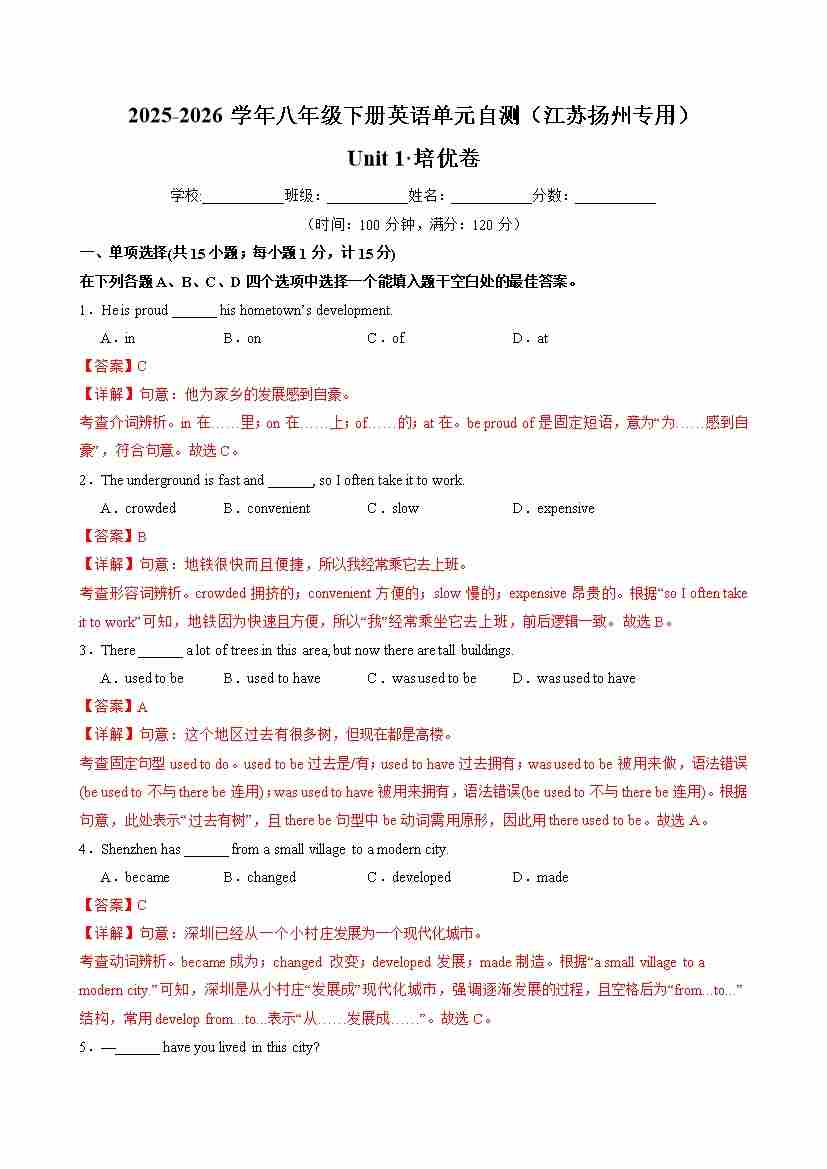 Unit 1 Past and present(单元自测·江苏扬州专用)(解析版)