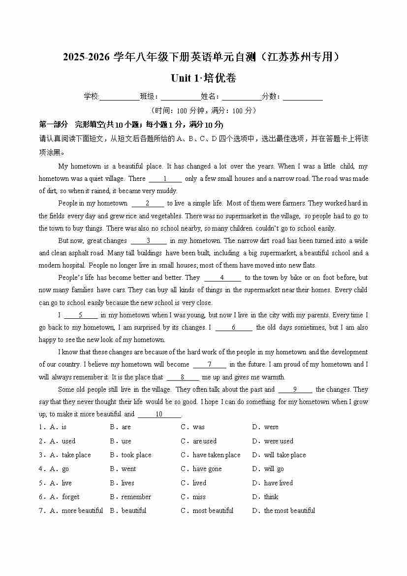 Unit 1 Past and present(单元自测·江苏苏州专用)(解析版)