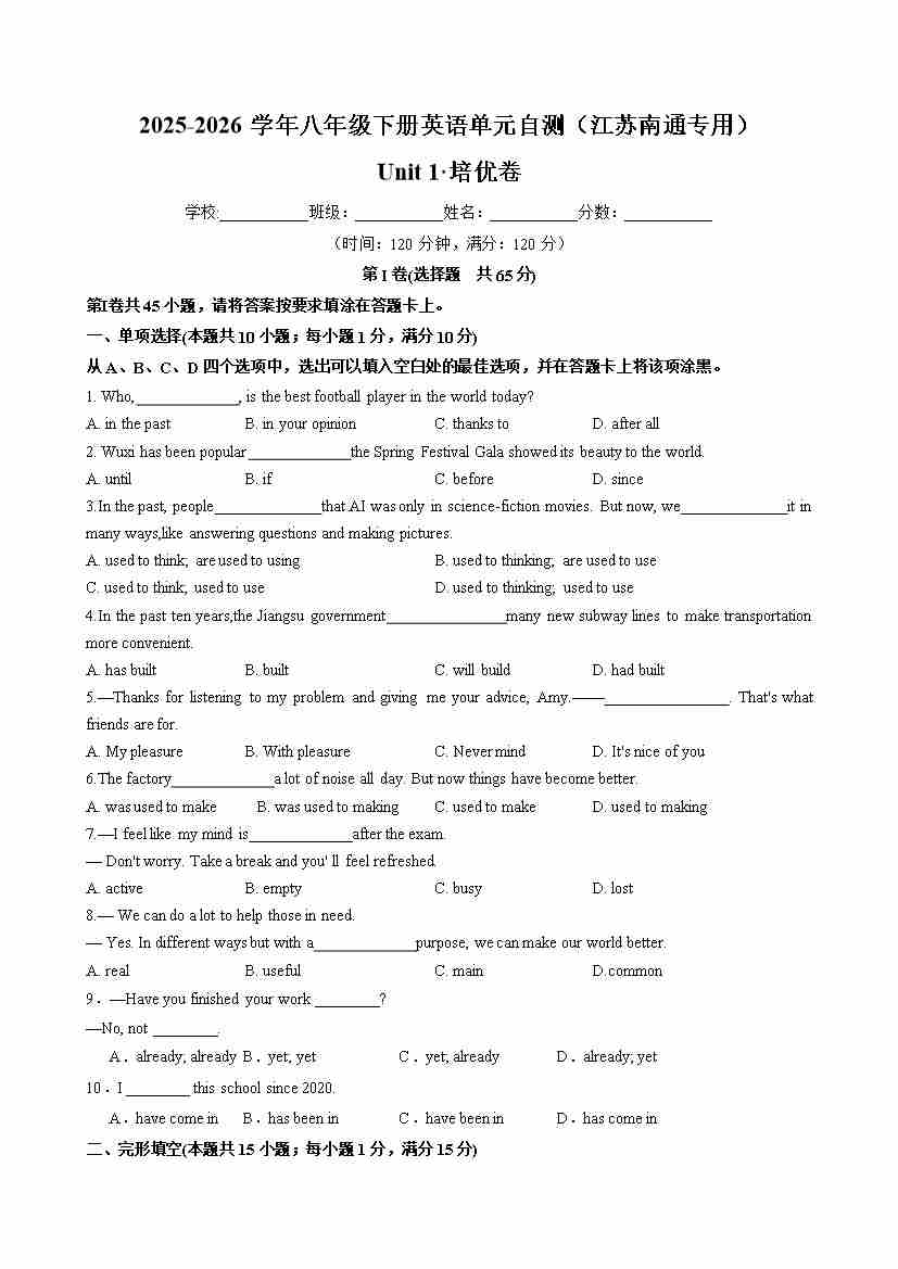 Unit 1 Past and present(单元自测·江苏南通专用)(试卷版A4)