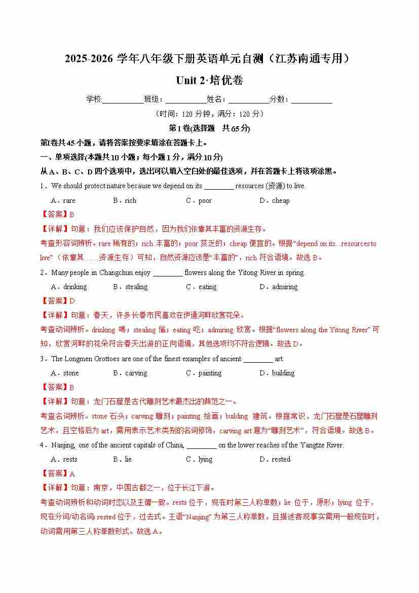 首页 > 全部 > 未知 Unit 2 Amazing China(单元自测·江苏南通专用)(解析版)