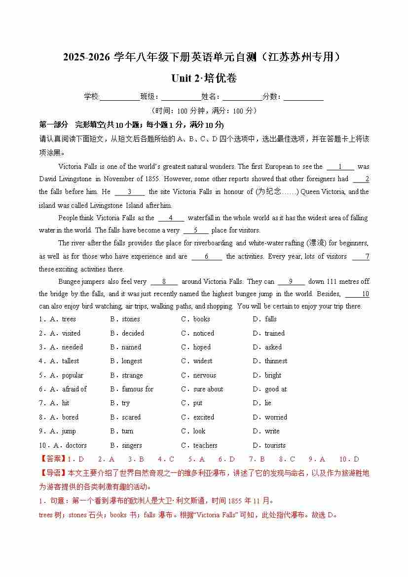 首页 > 全部 > 未知 Unit 2 Amazing China(单元自测·江苏苏州专用)(解析版)