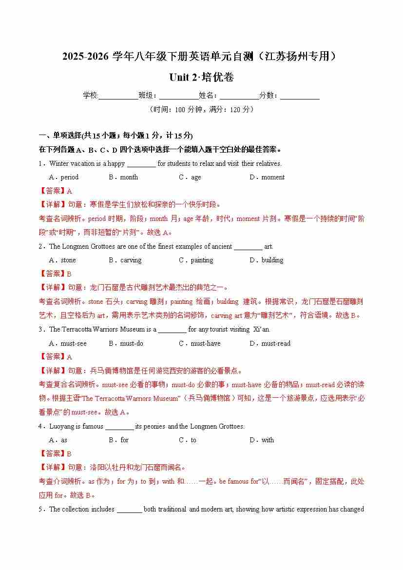 首页 > 全部 > 未知 Unit 2 Amazing China(单元自测·江苏扬州专用)(解析版)