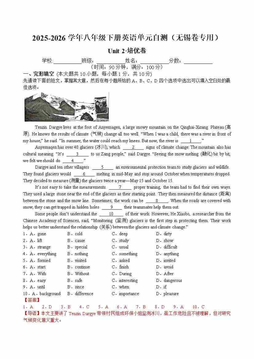 八年级英语下册Unit2 单元自测·无锡卷专用(解析版)