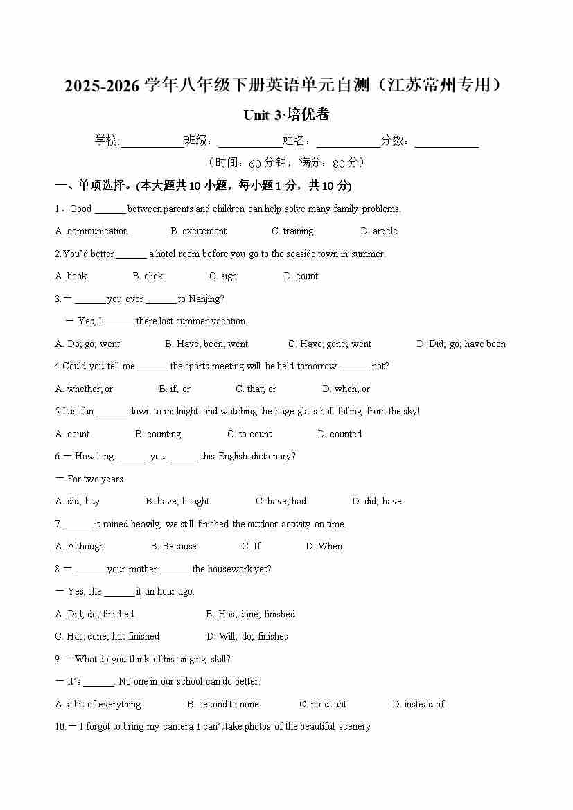 首页 > 全部 > 未知 八年级英语下册Unit 3 单元自测·江苏常州卷专用(考试版A4)