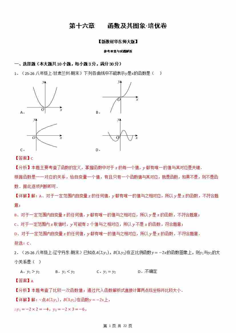 第十六章 函数及其图象(举一反三单元自测·培优卷)数学新教材华东师大版八年级下册(解析版)