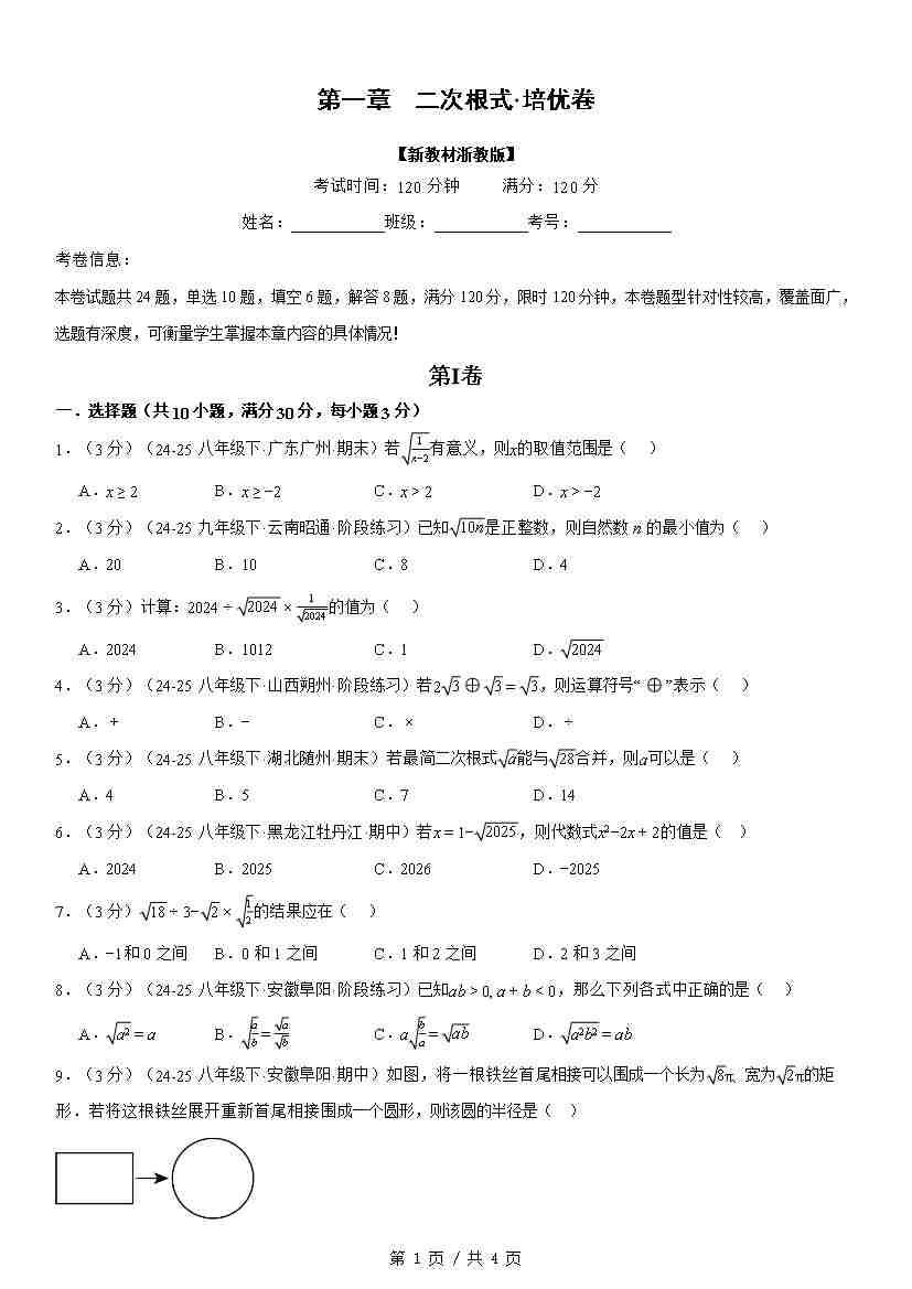 首页 > 全部 > 未知 第一章 二次根式(举一反三单元自测·培优卷)数学新教材浙教版八年级下册(试题版)