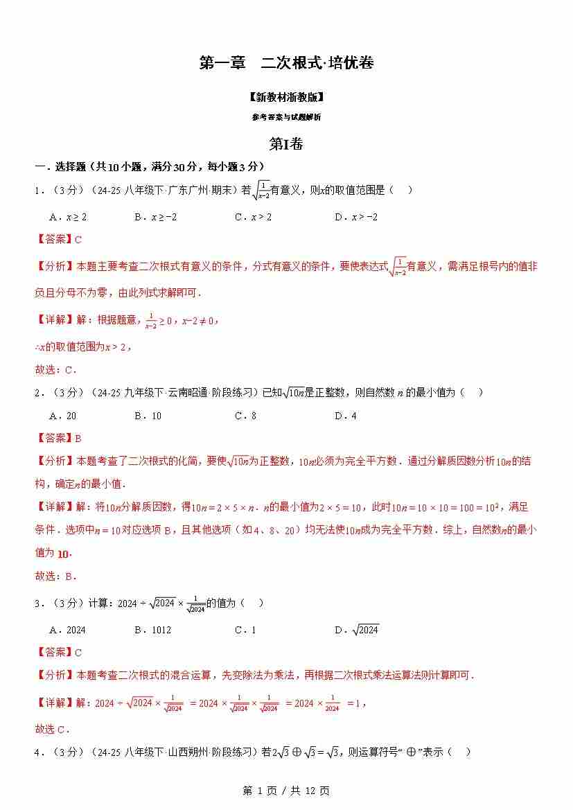 首页 > 全部 > 未知 第一章 二次根式(举一反三单元自测·培优卷)数学新教材浙教版八年级下册(解析版)