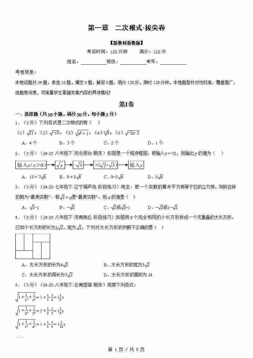 第一章 二次根式(举一反三单元自测·拔尖卷)数学新教材浙教版八年级下册(试题版)1
