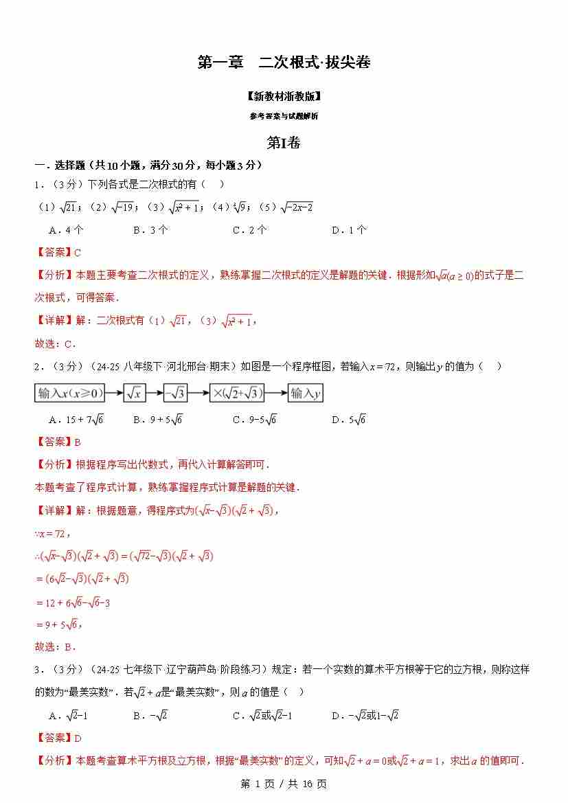 第一章 二次根式(举一反三单元自测·拔尖卷)数学新教材浙教版八年级下册(解析版)1