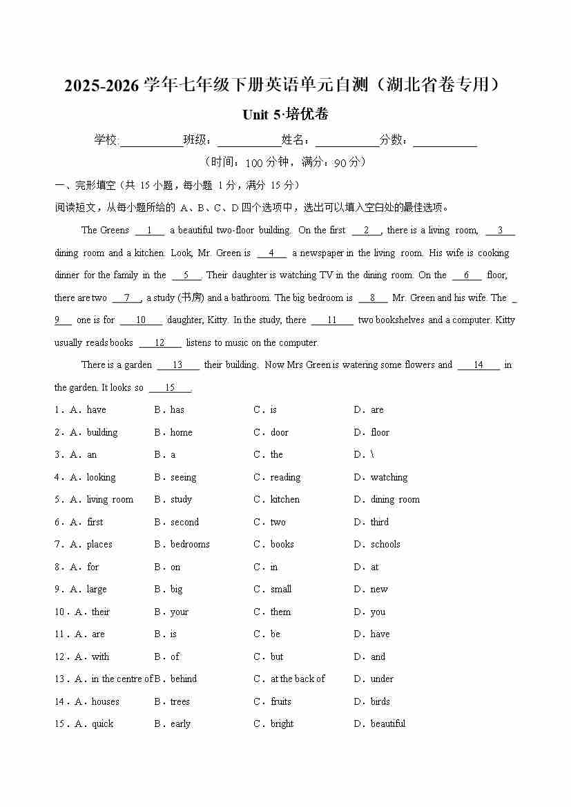 首页 > 全部 > 单元地区卷 > 七年级英语下册Unit 5 单元自测·湖北省卷专用(试题版A4)