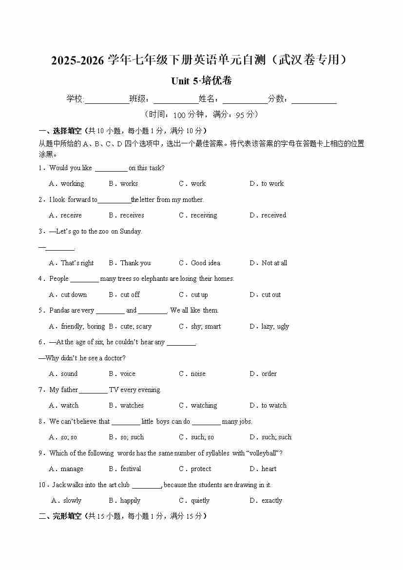七年级英语下册Unit 5 单元自测·武汉卷专用(试题版A4)