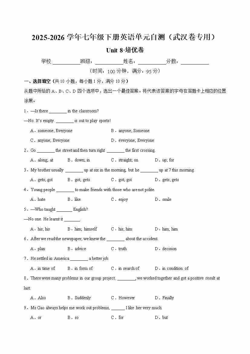 七年级英语下册Unit 8 单元自测·武汉卷专用(试题版A4)