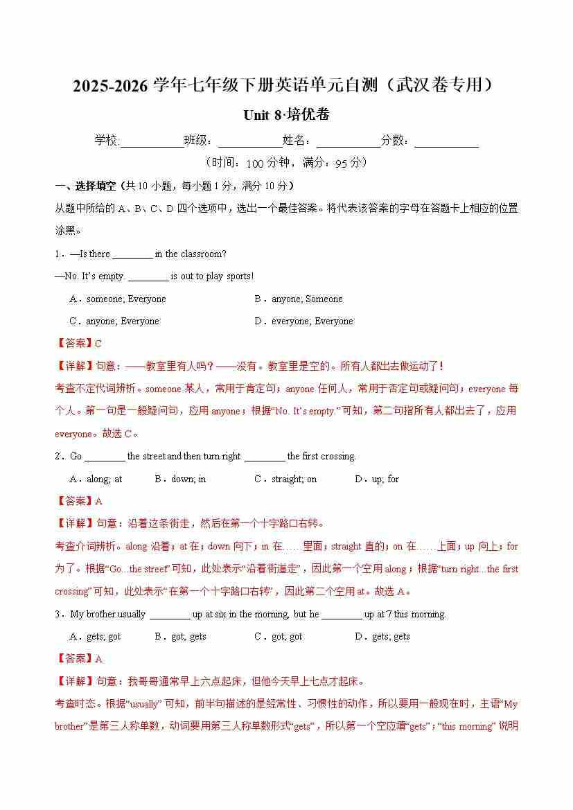 七年级英语下册Unit 8 单元自测·武汉卷专用(解析版)