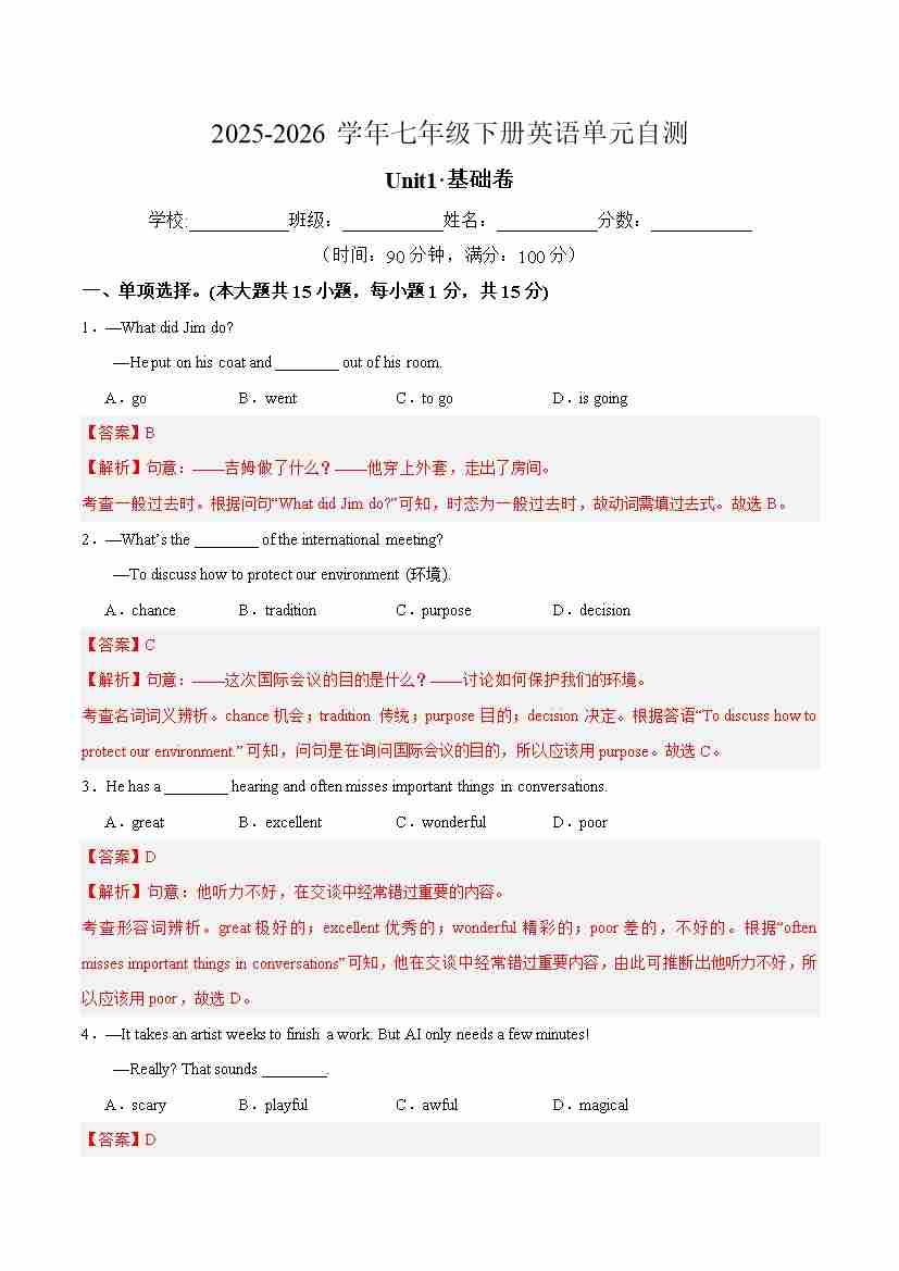 首页 > 全部 > 未知 七年级英语下册Unit1单元自测·基础卷(解析版)外研版