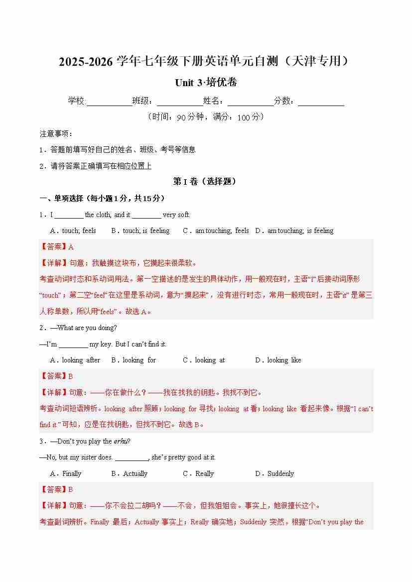 七年级Unit 3 单元自测·天津专用 (解析版)