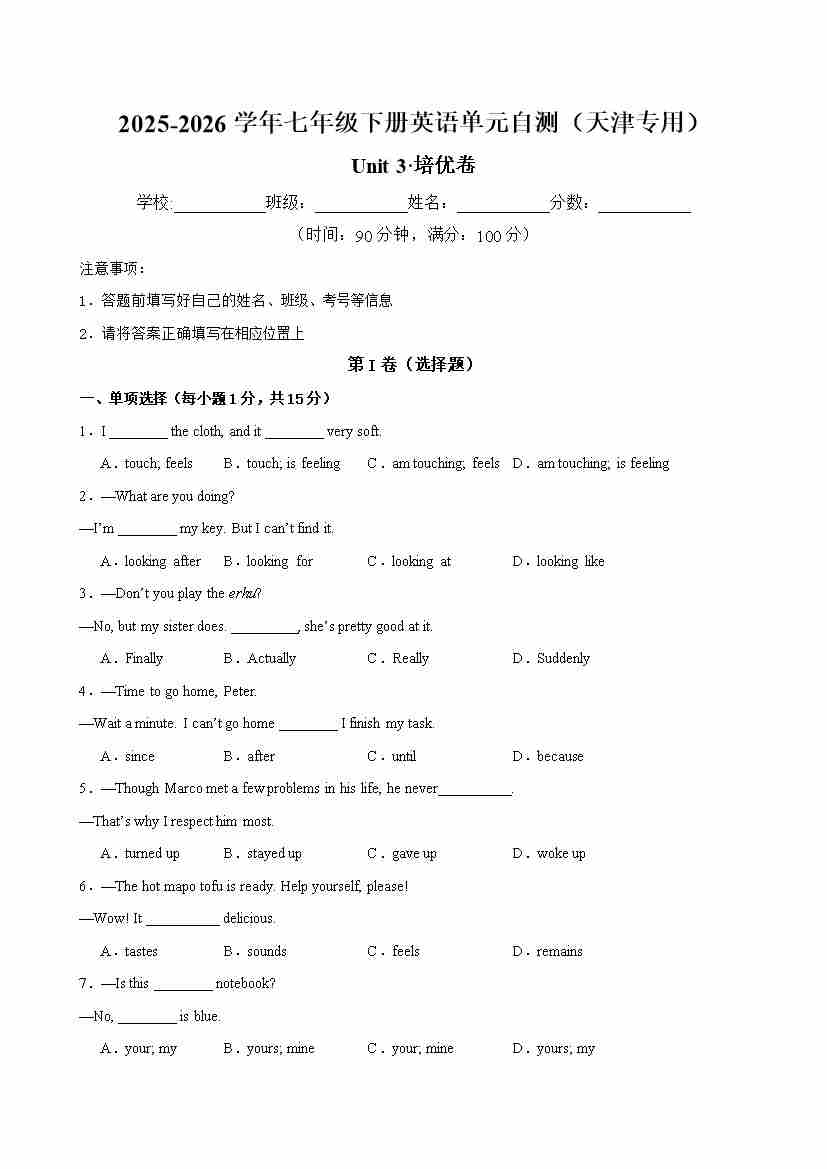 七年级Unit 3 单元自测·天津专用 (试题版A4)