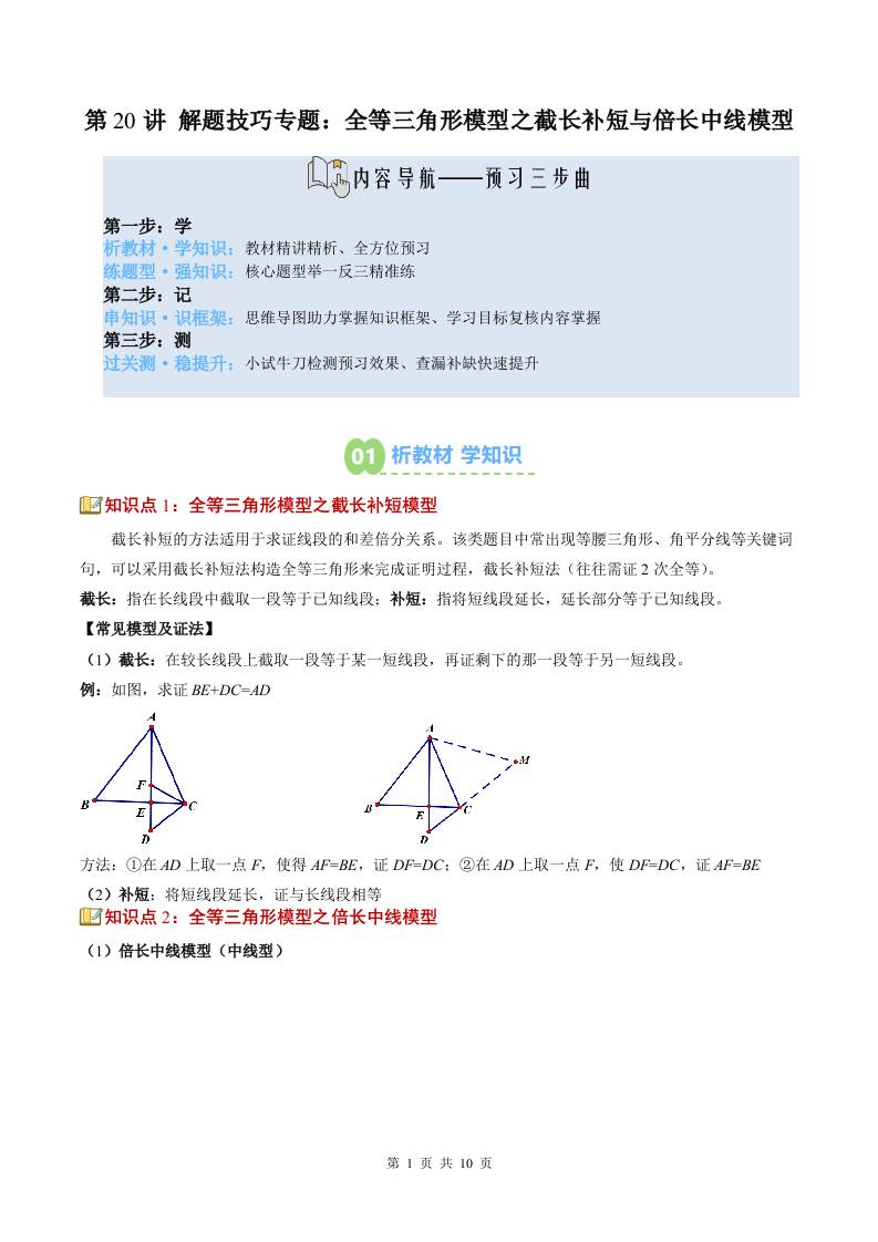 首页 > 全部 > 寒假讲义 > ②寒假预习-第20讲 解题技巧专题:全等三角形模型之截长补短与倍长中线模型(2知识点2大题型过关测)(学生版)-2026学年七年级数学寒假衔讲练(北师大版-新教材)