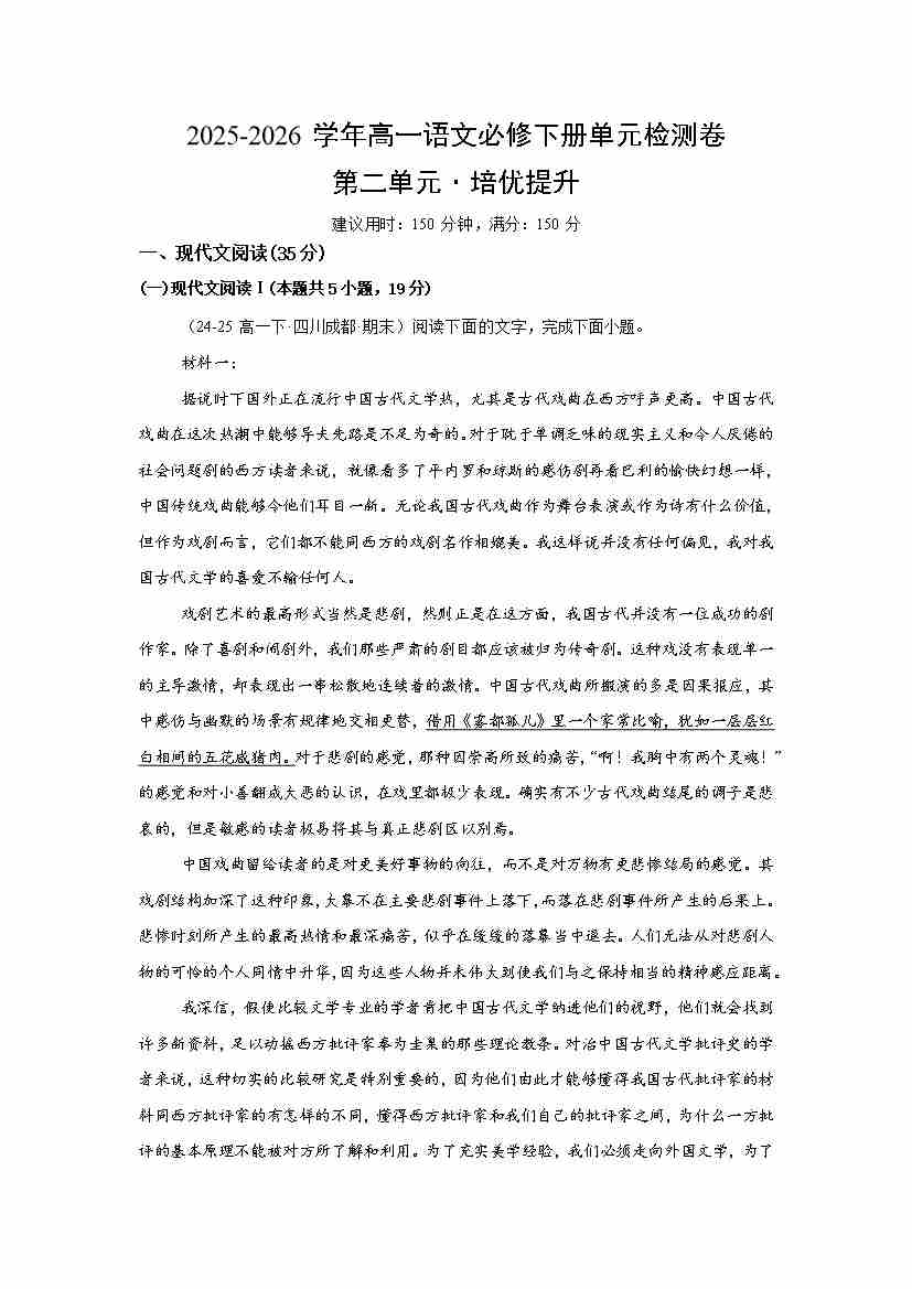 高一语文必修下册第二单元测试·提升卷(考试版A4)