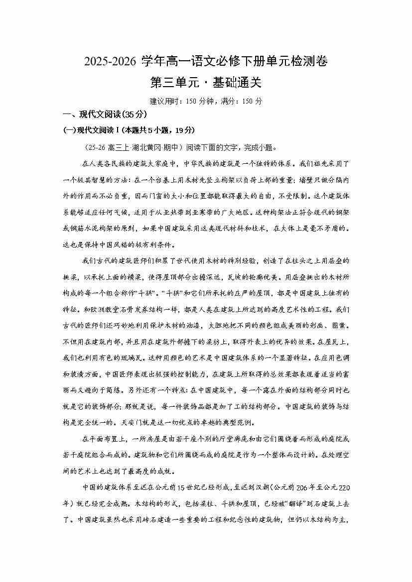 高一语文必修下册第三单元测试·基础卷(解析版)