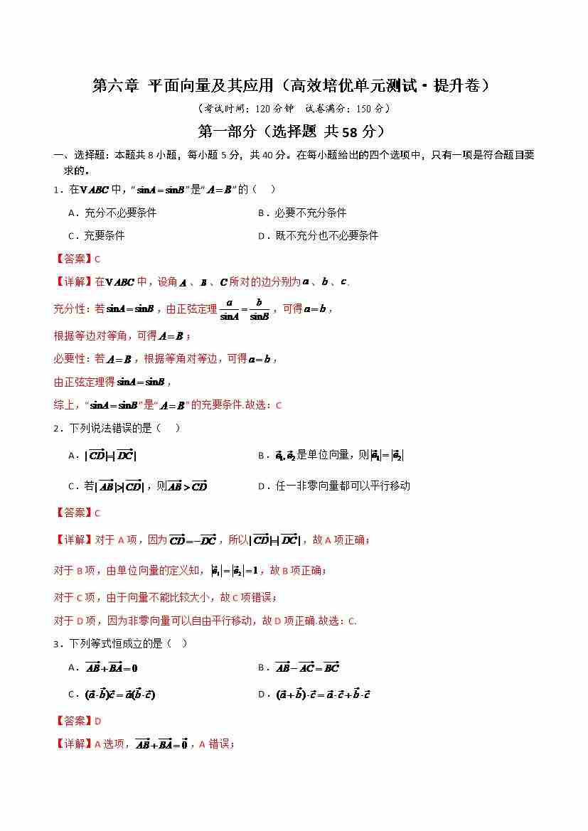 首页 > 全部 > 未知 第六章 平面向量及其应用(高效培优单元自测·提升卷)(解析版)