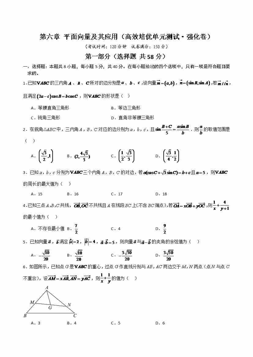 第六章 平面向量及其应用(高效培优单元自测·强化卷)(原卷版)