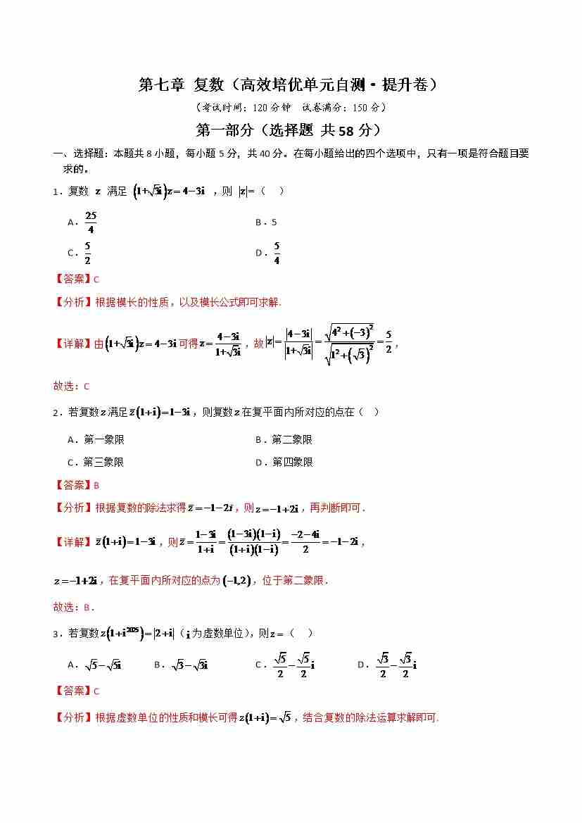 首页 > 全部 > 未知 第七章 复数(高效培优单元自测·提升卷)(解析版)