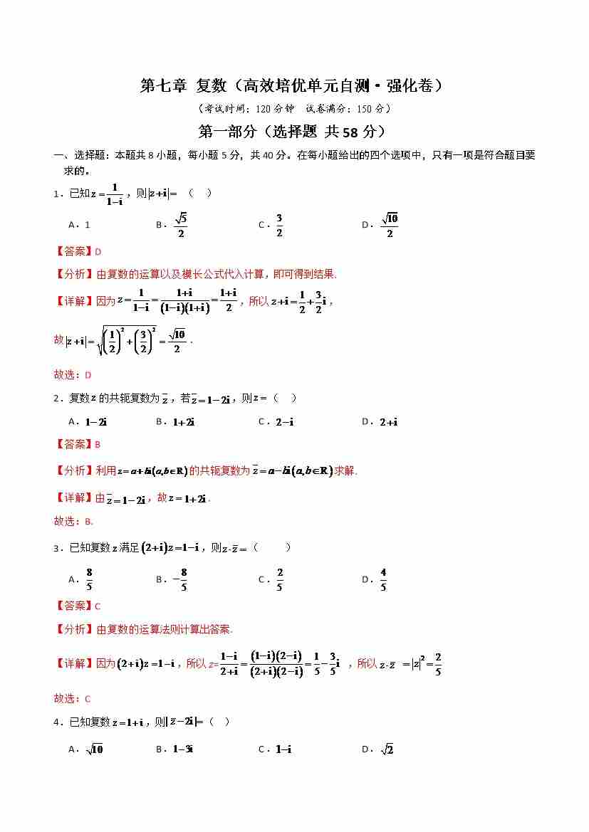 首页 > 全部 > 未知 第七章 复数(高效培优单元自测·强化卷)(解析版)