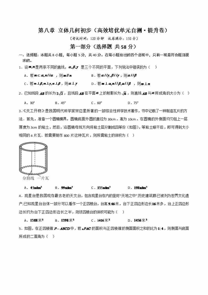 第八章 立体几何初步(高效培优单元自测·提升卷)(试题版)
