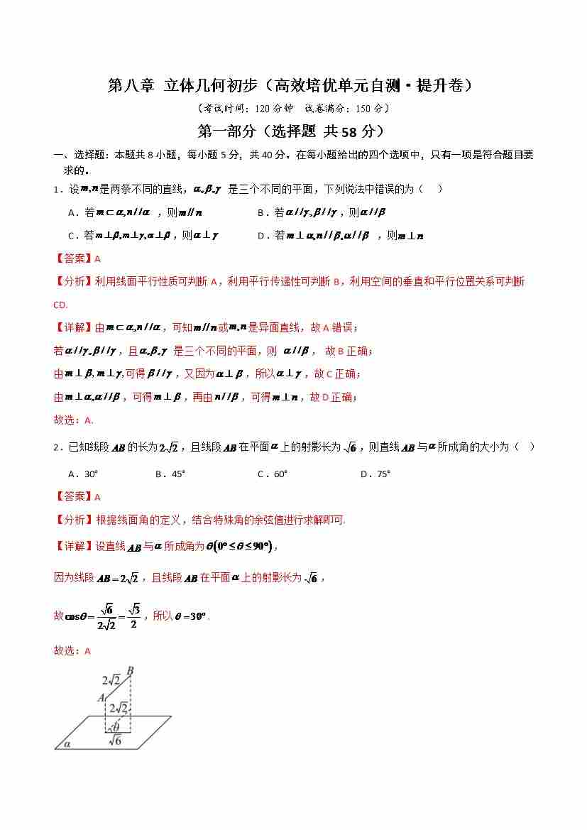 第八章 立体几何初步(高效培优单元自测·提升卷)(解析版)