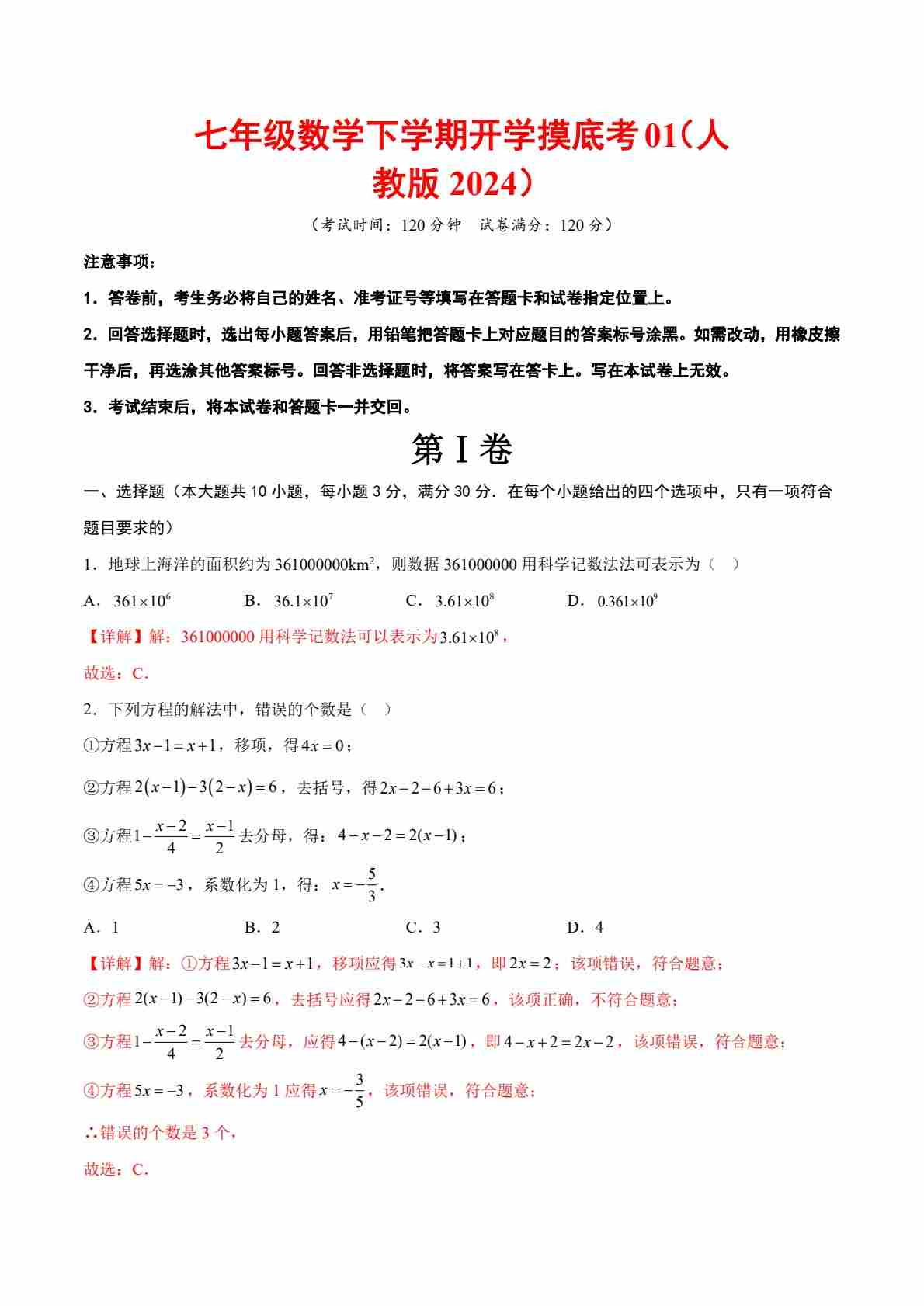 首页 > 全部 > 未知 《数学•开学摸底考》七年级解析卷01(人教)