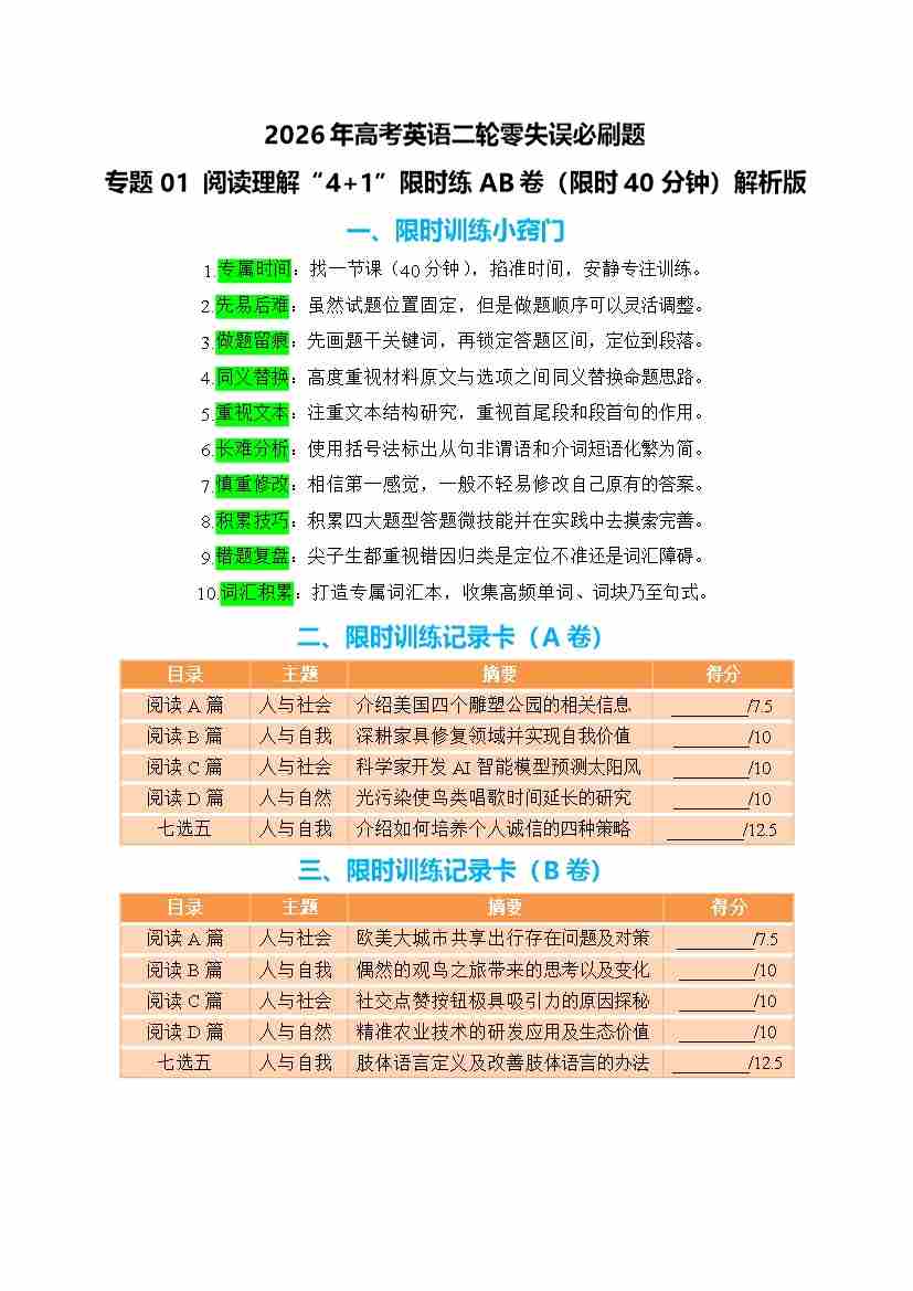 首页 > 全部 > 未知 专题01 阅读理解“4加1”限时练AB卷 教师版