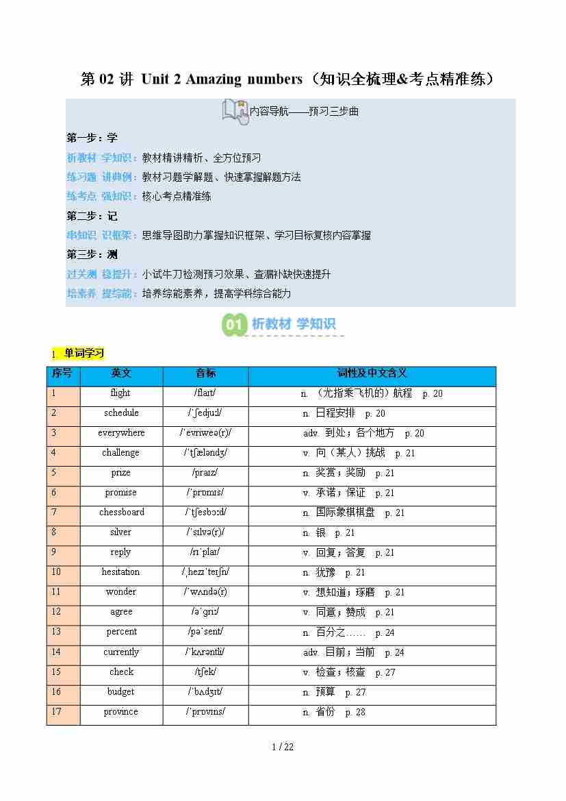 第2部分 预习 第02讲 Unit 2 Amazing numbers(知识全梳理---考点精准练)(学生版)-2025年新八年级英语暑假衔接(沪教版)八上英语--沪教-暑假讲义