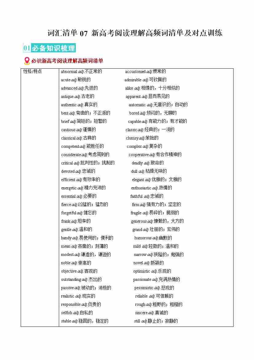 词汇清单07 阅读理解高频词(按主题分类清单)(必备知识·对点训练)(教师版)