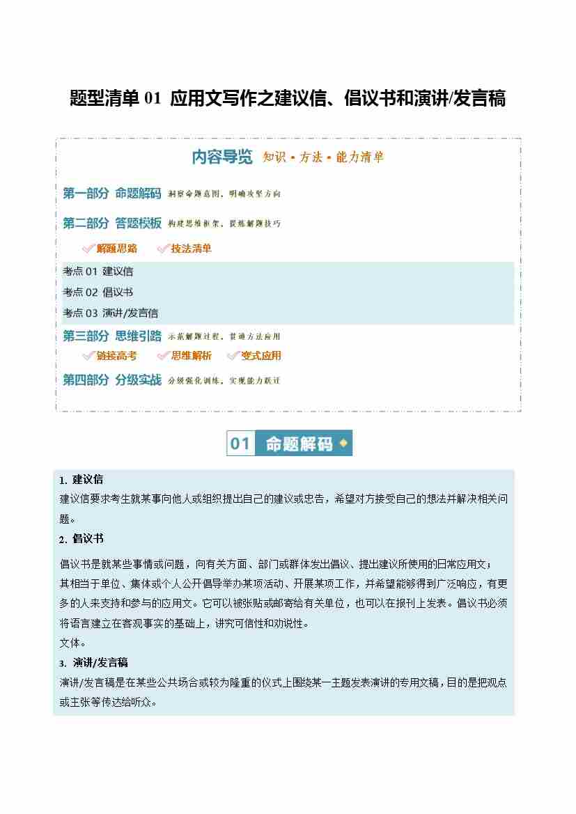 首页 > 全部 > 未知 题型清单01 应用文写作之建议信、倡议书和演讲发言稿(知识·方法·能力清单)(教师版)