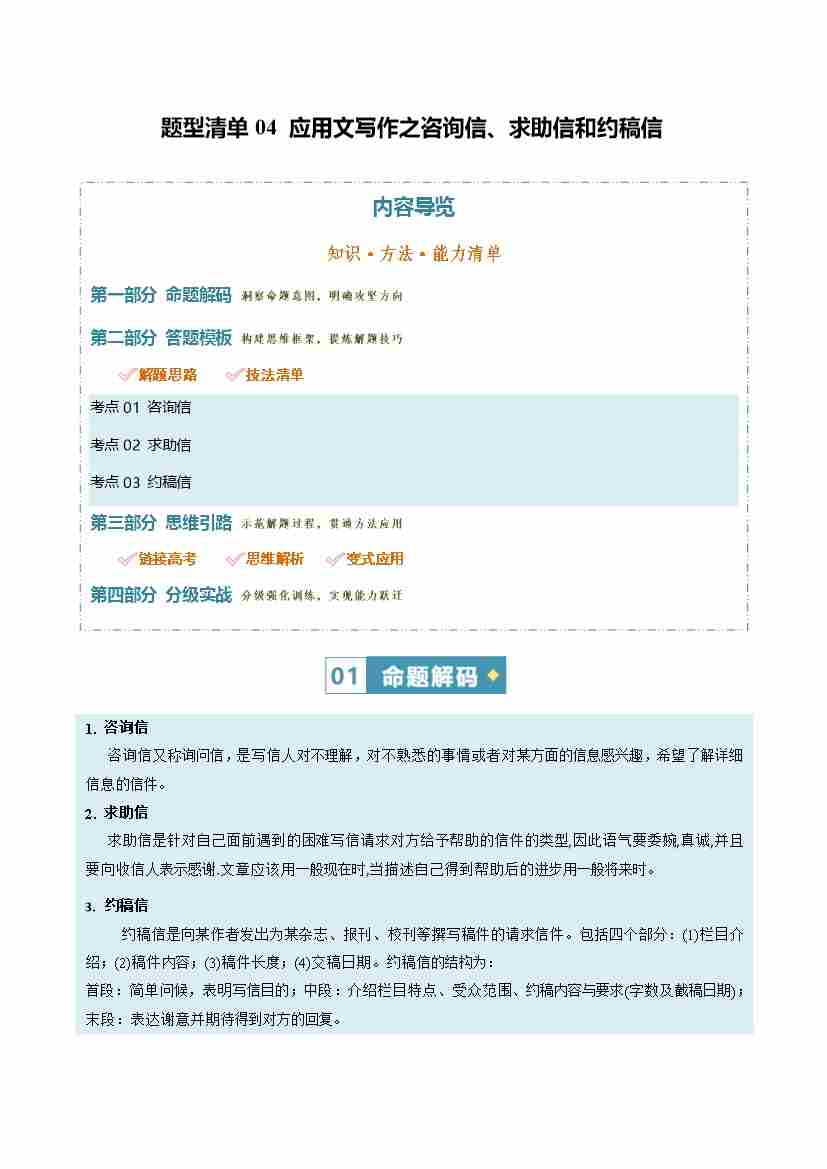 题型清单04 咨询信、求助信和约稿信(知识·方法·能力清单)(学生版)