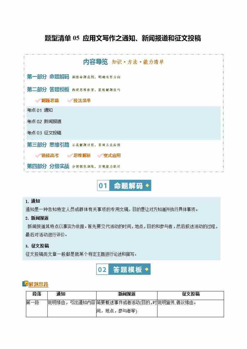 题型清单05 通知、新闻报道和征文投稿(知识·方法·能力清单)(教师版)