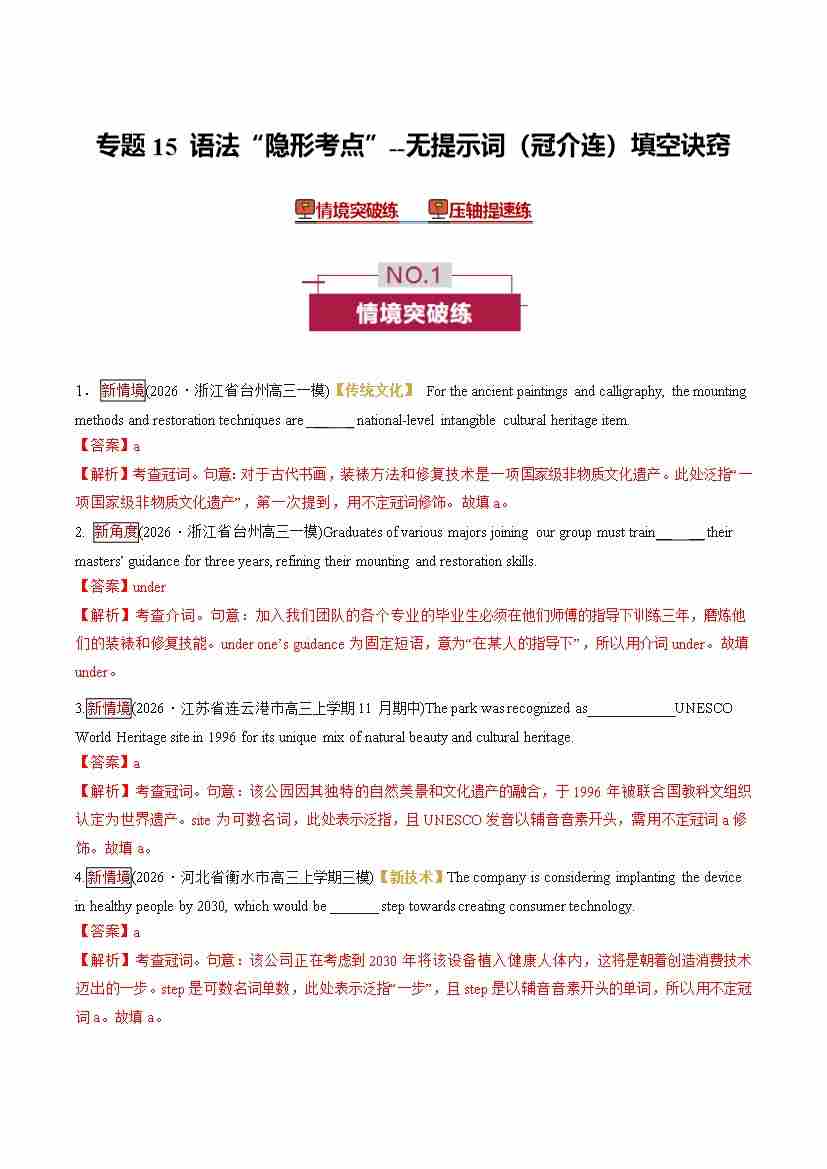 首页 > 全部 > 未知 专题15 语法“隐形考点”--无提示词(冠介连)填空诀窍(培优专练)(全国通用)(教师版)