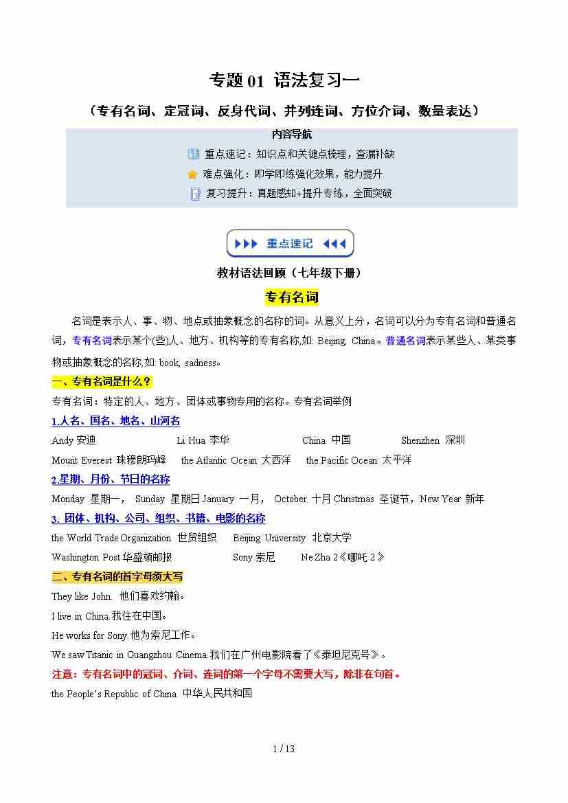 第1部分 复习 专题01 核心语法复习一(专有名词、定冠词、反身代词、并列连词、方位介词、数量表达)(学生版)-2025年新八年级英语暑假衔接(沪教版)八上英语--沪教-暑假讲义
