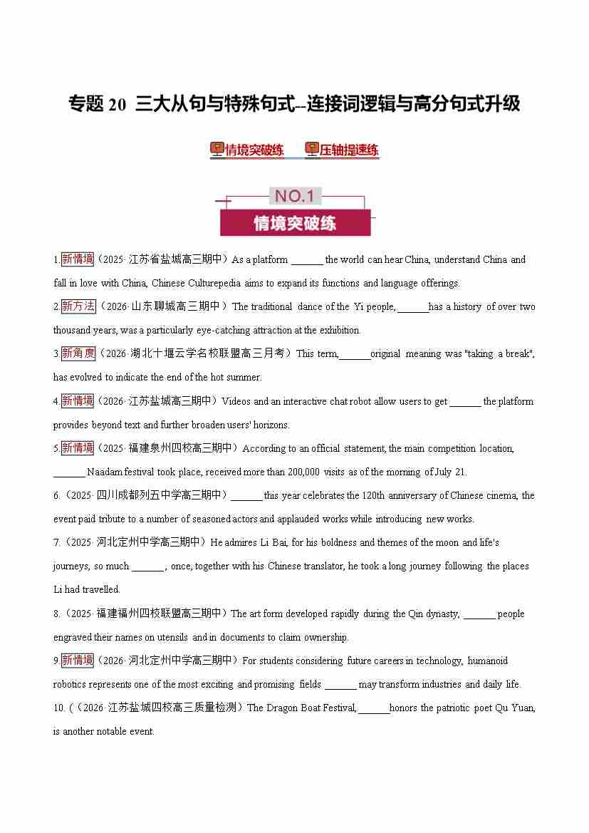 首页 > 全部 > 未知 专题20 三大从句与特殊句式 —— 连接词逻辑与高分句式升级 (培优专练)(全国通用)(学生版)