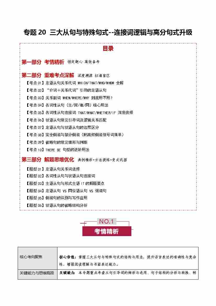 首页 > 全部 > 未知 专题20 三大从句与特殊句式 —— 连接词逻辑与高分句式升级 (培优讲义)(全国通用)(学生版)