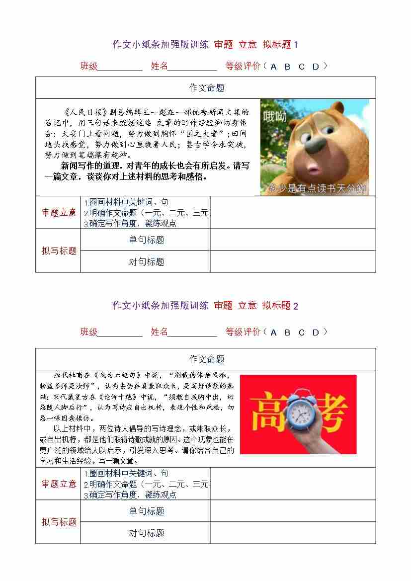 首页 > 全部 > 未知 作文小纸条训练加强版——审题 立意 拟标题(20练) 训练版