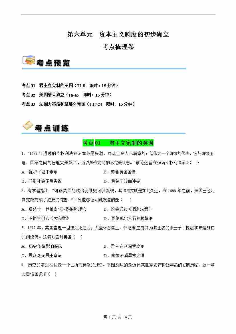 首页 > 全部 > 单元检测卷 > 第六单元 资本主义制度的初步确立【单元测试·考点梳理卷】单元速记·巧练