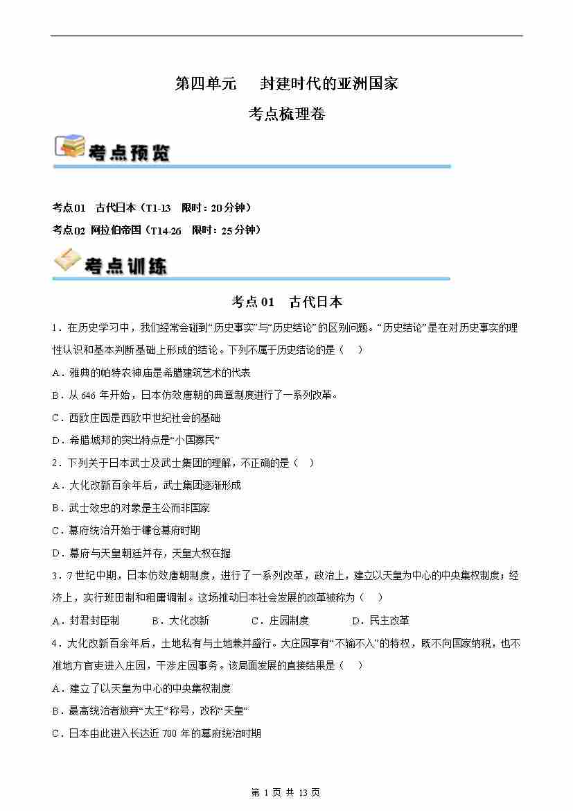 首页 > 全部 > 单元检测卷 > 第四单元 封建时代的亚洲国家【单元测试·考点梳理卷】单元速记·巧练
