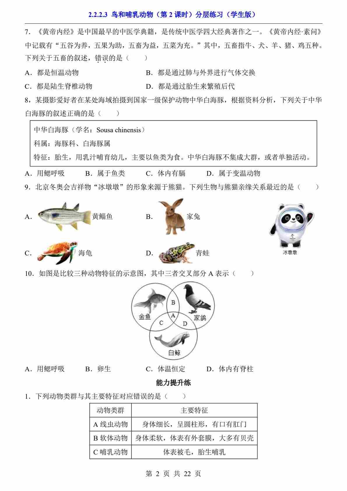 首页 > 全部 > 一课一练 > 2.2.2.3 鸟和哺乳动物 第2课时(分层练习)